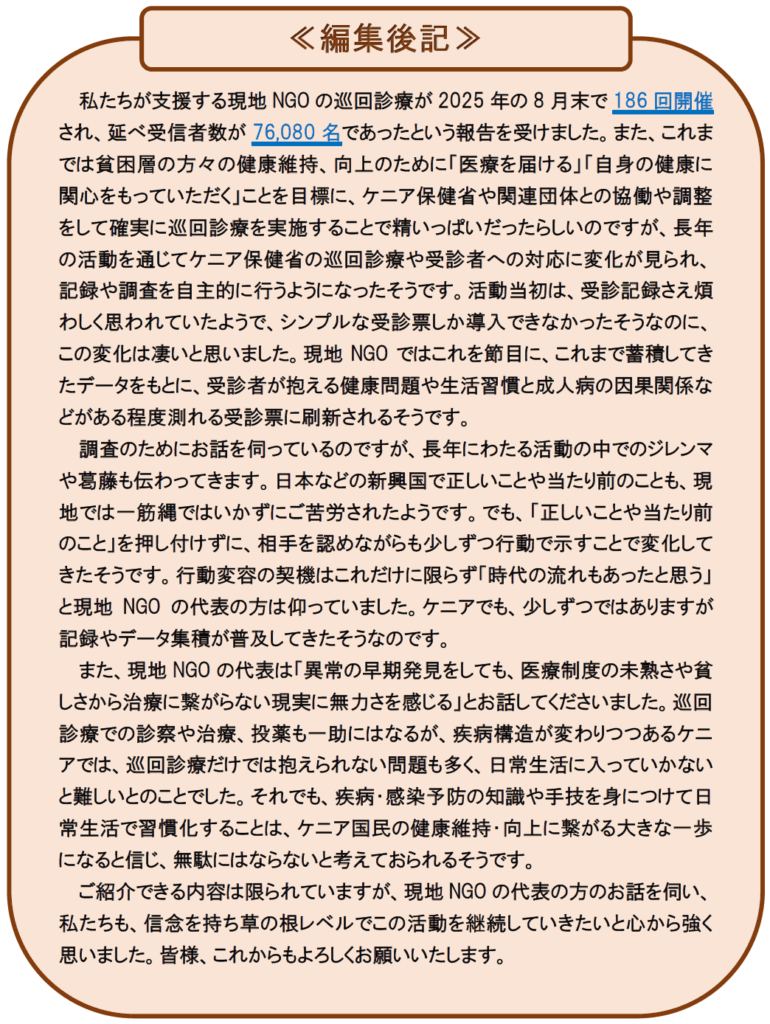 ケニア保健省、現地NGOと日程調整をしてお応えできるようにします。