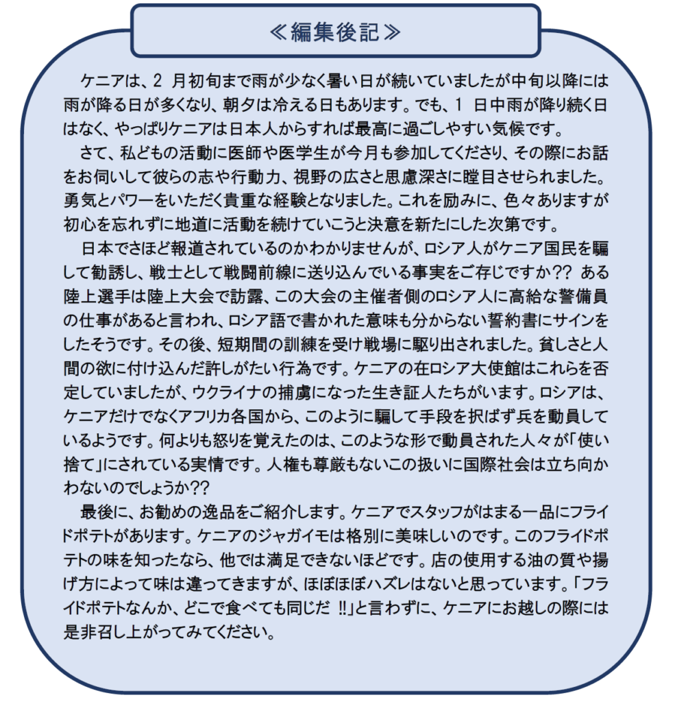 ✓ 現地 NGO の現地マネージャー(ケニア人)から申請があり、感染予防の